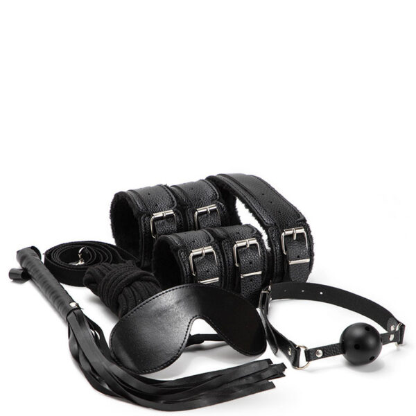 Kit bondage com 8 peças. Possui: 1 venda, 1 mordaça, 1 par de algemas,
