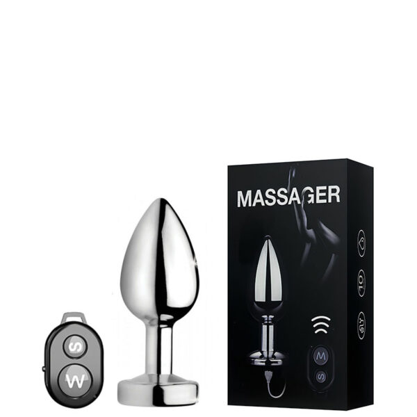 Plug anal recarregável em metal com controle remoto. Possui 10 modos de vibração.